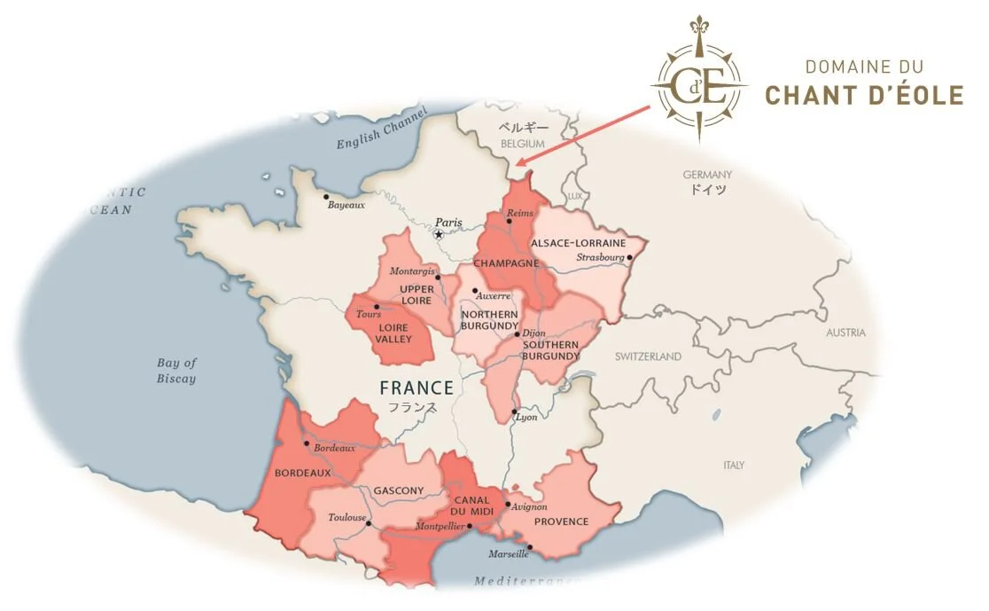 Domaine Du Chant D’Éole はベルギーの南部、フランスとの国境から 5 キロの所に位置しています。シャンパーニュ地方の中心地レンヌから車でわずか 2 時間の距離です。