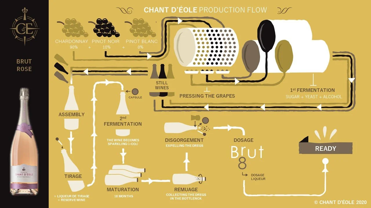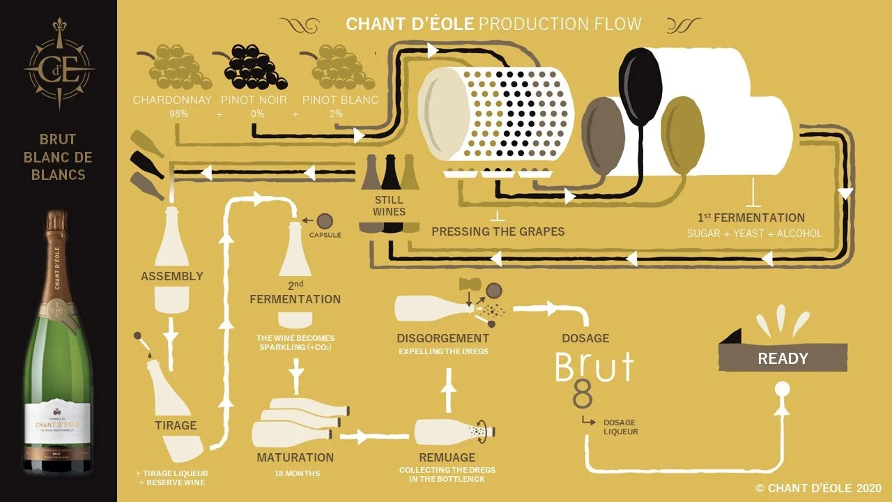 品質を保つため、瓶の中で二次発酵を促すワイン醸造の伝統的な方法を用い、“Sur Latte”と呼ばれる醸造プロセスと組み合わせています。Domaine du Chant d’Éole では少なくとも18か月以上に亘り行われます。